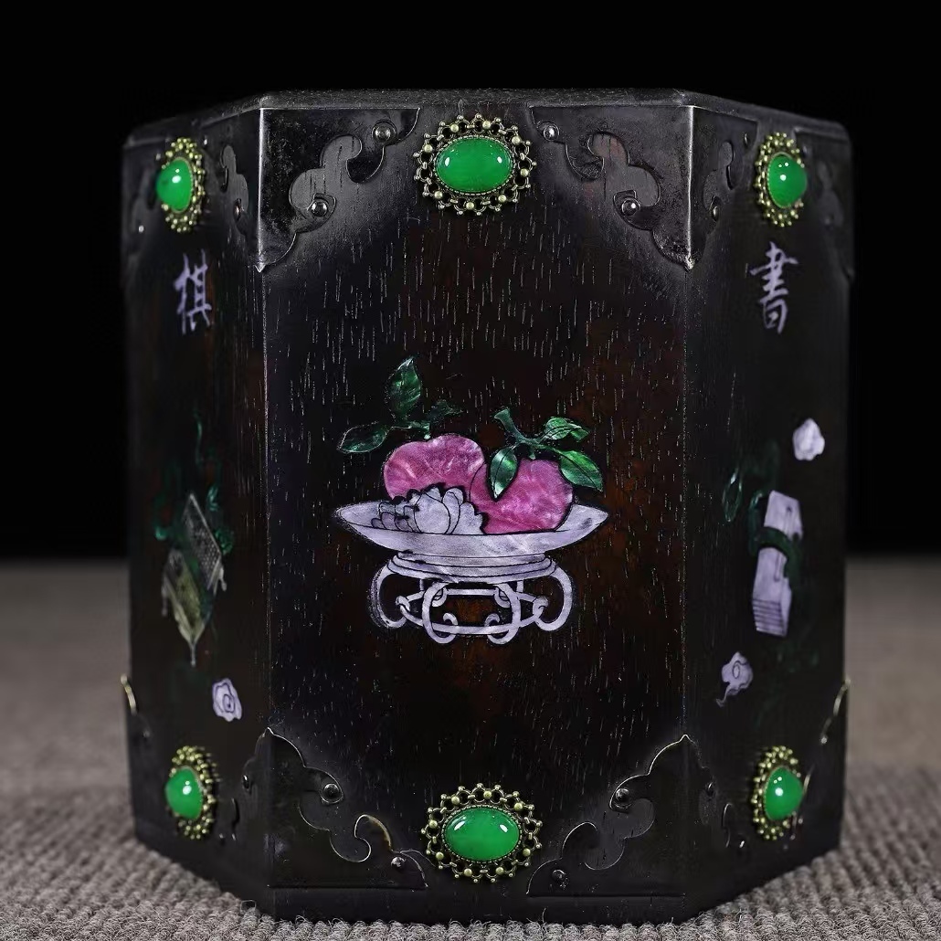 - 古木彫り 秘藏 清代 古黑檀木 嵌貝殼 包銅嵌寶石 琴棋書畫筆筒 書道具 文房具 時代物 中国 細密彫 置物 賞物 唐物 木彫り 文玩 6.5