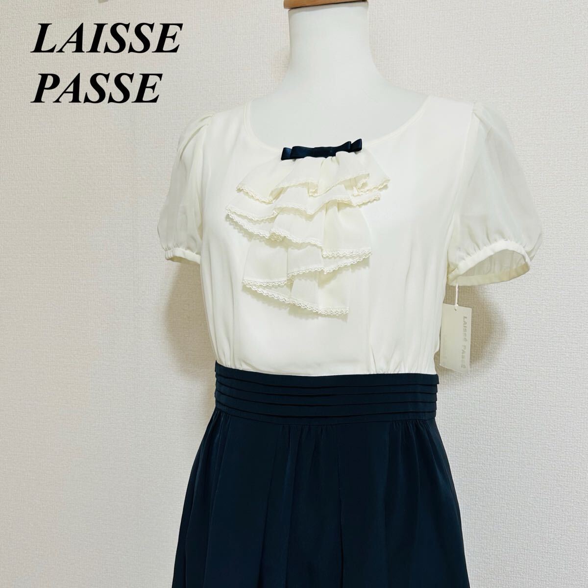 - 定価2万 新品 未使用 LAISSE PASSE レッセパッセ ワンピース 半袖 膝丈 フリル ドッキング デザイン切替 ネイビー ホワイト 38 Mサイズ