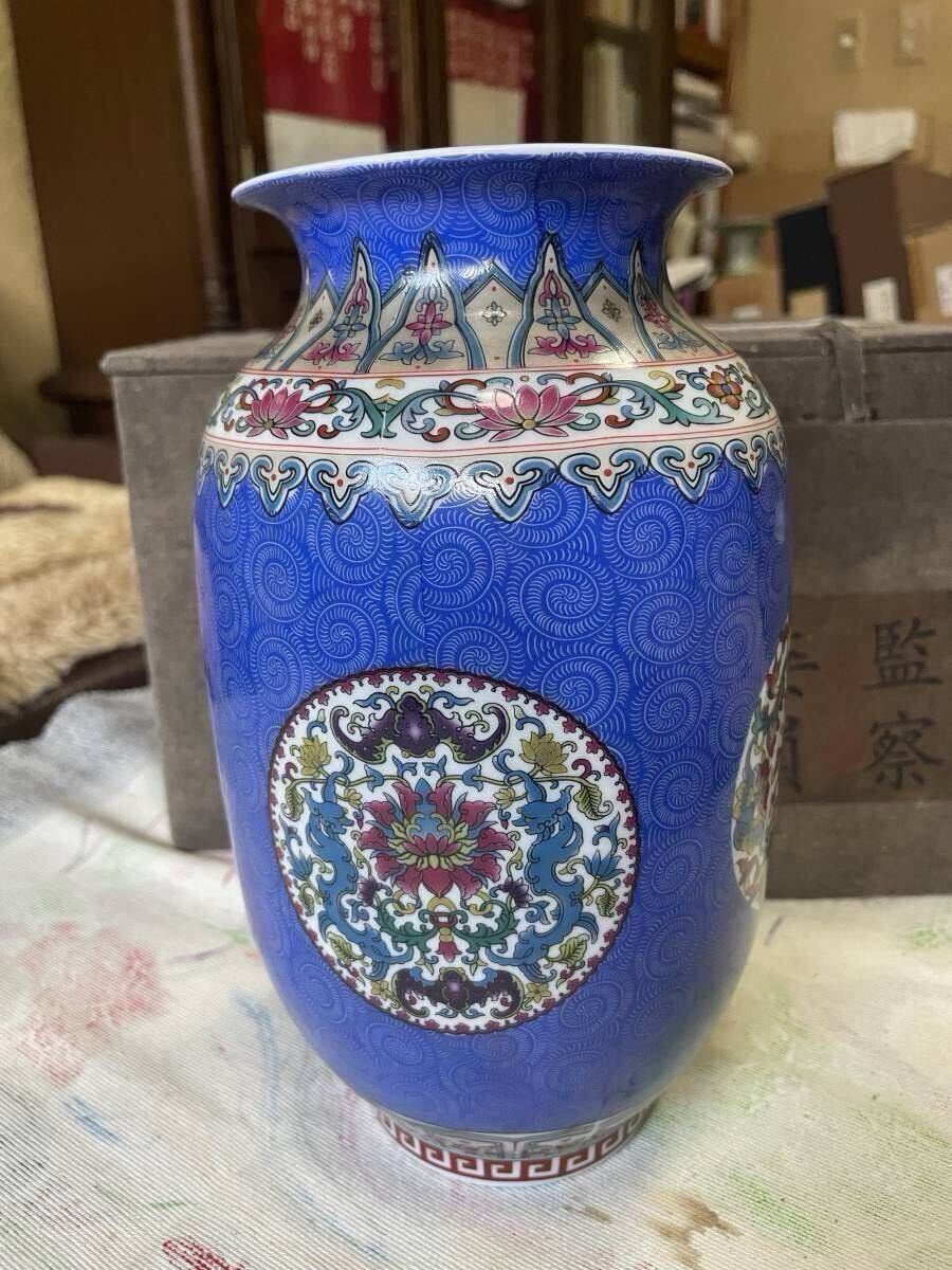 - 【故宮保管委員会】藍地紋粉彩冬瓜瓶 約22x13cm(口径10cm) 内政部 北平古物陳列所 中国美術 骨董 清 乾隆年製