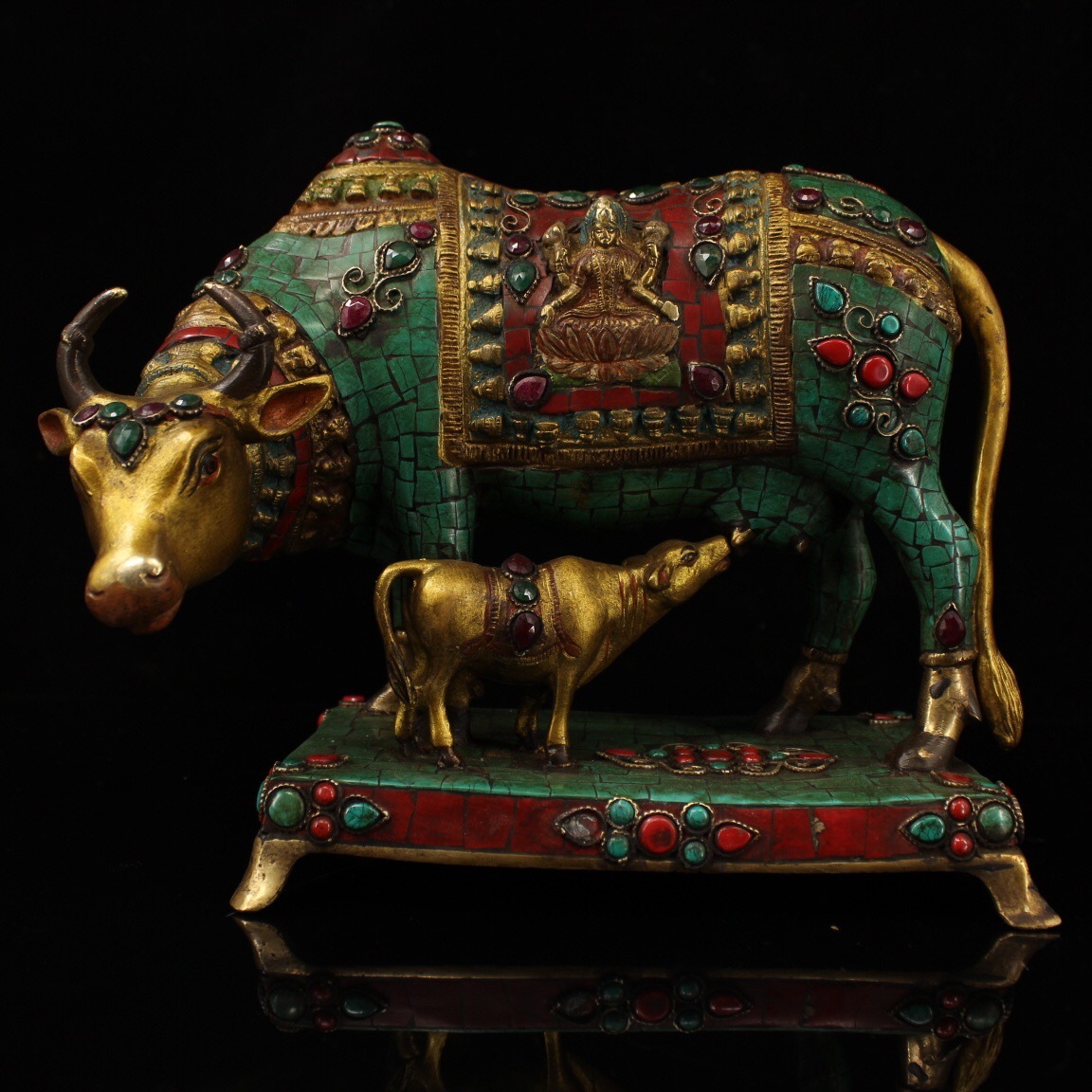 - 【超珍館蔵】銅製 寶石嵌 描金 彩繪 母子牛 置物 賞物 古賞物 古董品 古美術品 時代物 旧家蔵出 稀少珍蔵品