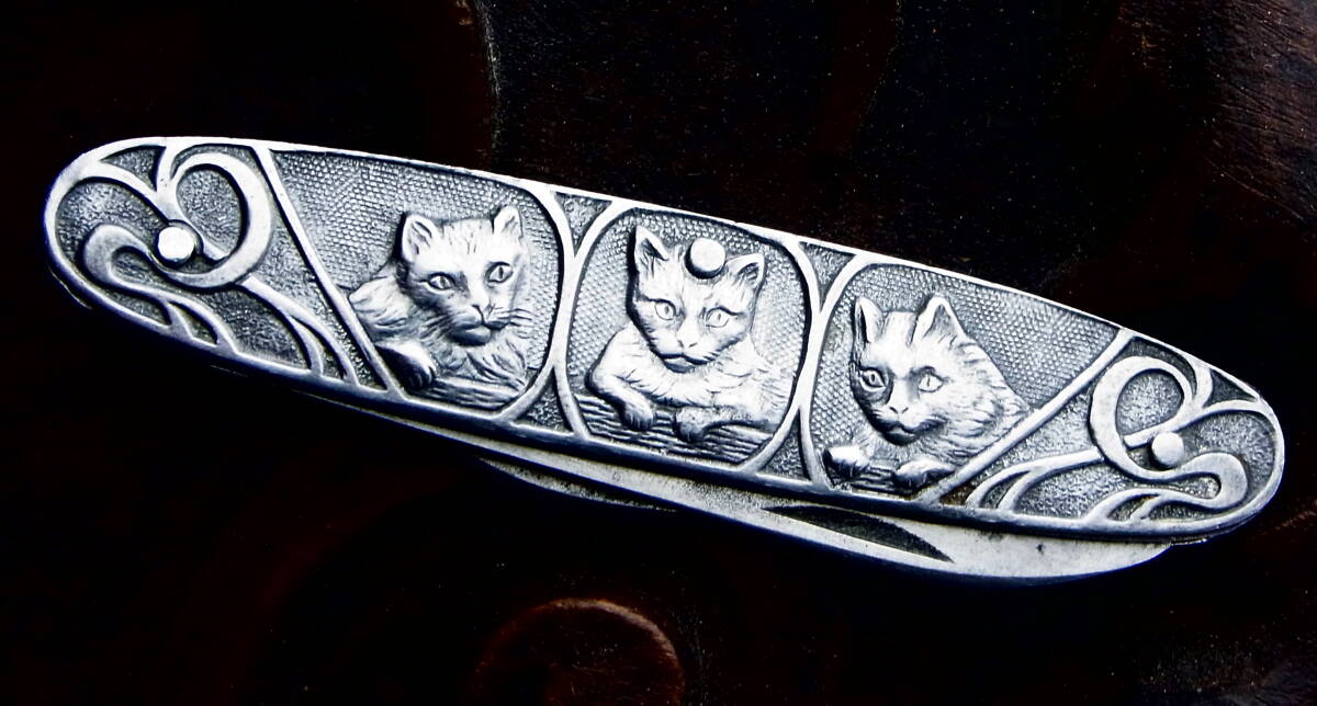 - フランスアンティーク ヴィンテージ 3匹のネコ ポケットナイフ 子猫たちが覗く携帯ナイフ 西洋民藝骨董 クロネコ宅急便発送