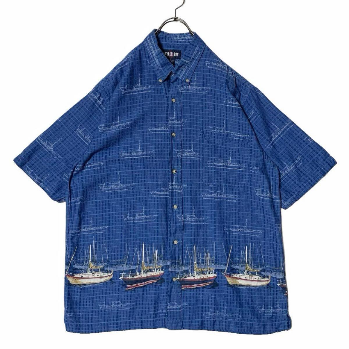 > ボタンダウン アロハシャツ L ブルー コットン レーヨン 総柄 船 チェック ハワイアン 半袖 古着 アメカジ ビンテージ vintage 00s y2k