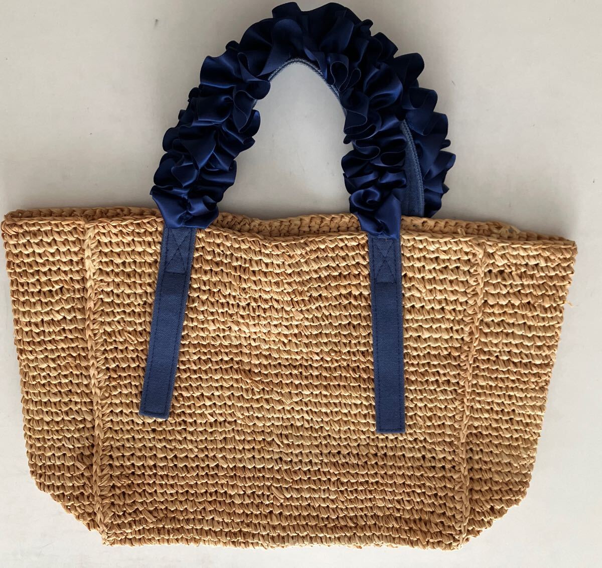 - ラフィア 持ち手フリルリボンかごバッグ ネイビー トートバッグ ハンドバッグ