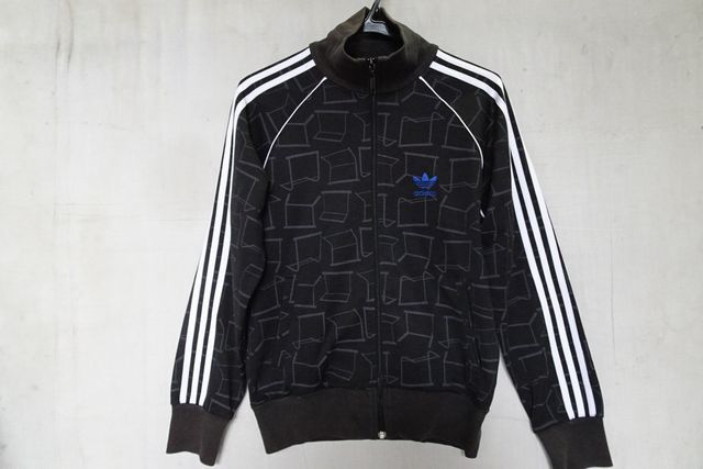 - adidas/アディダス/長袖トラックジャケット/ジャージ素材/前ジップアップ/ハードル柄/白3本ライン/三つ葉ロゴ/黒/ブラック/Sサイズ(6/24R7)