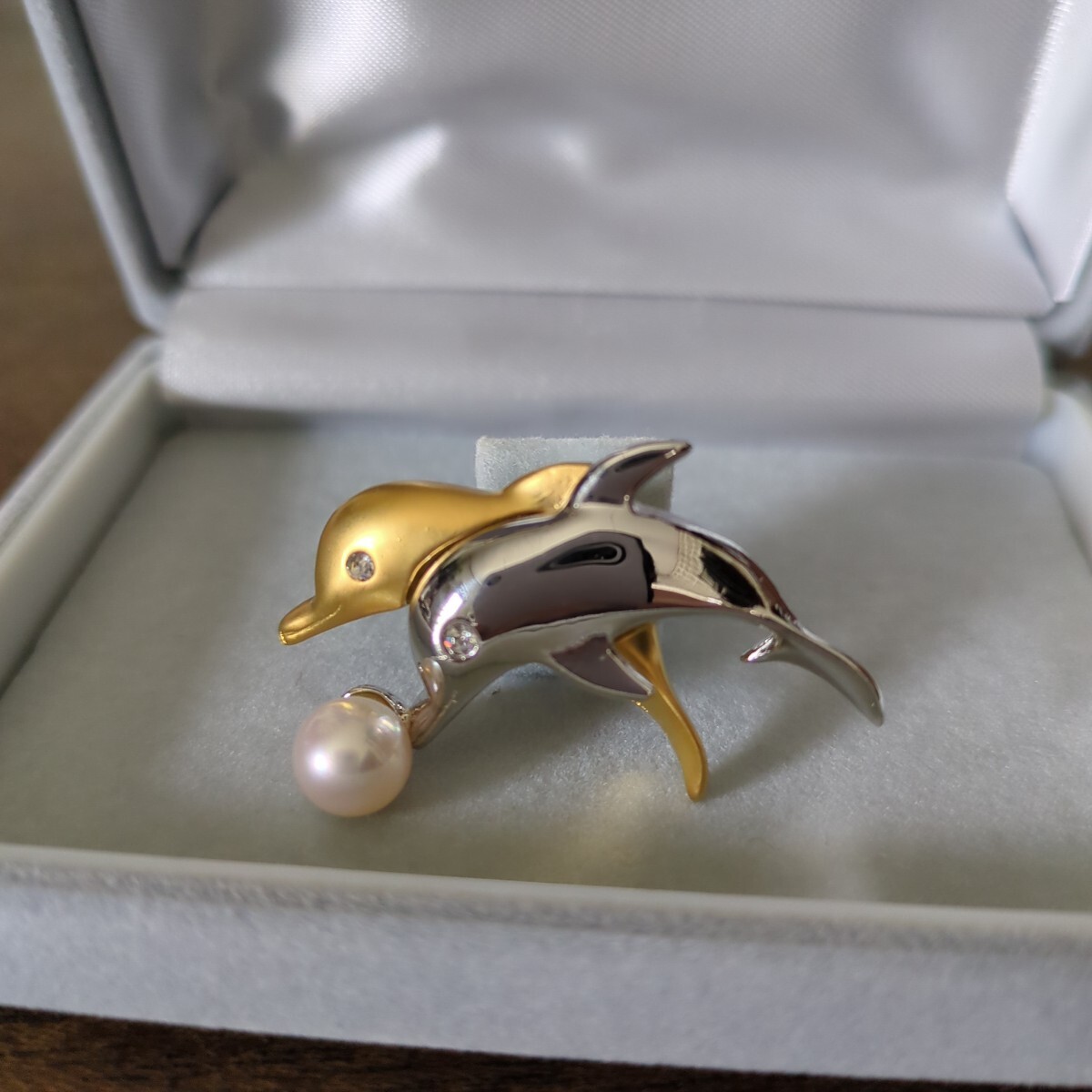 - パール 真珠 ピンバッチ ブローチ イルカモチーフ シルバー ゴールド コンビ