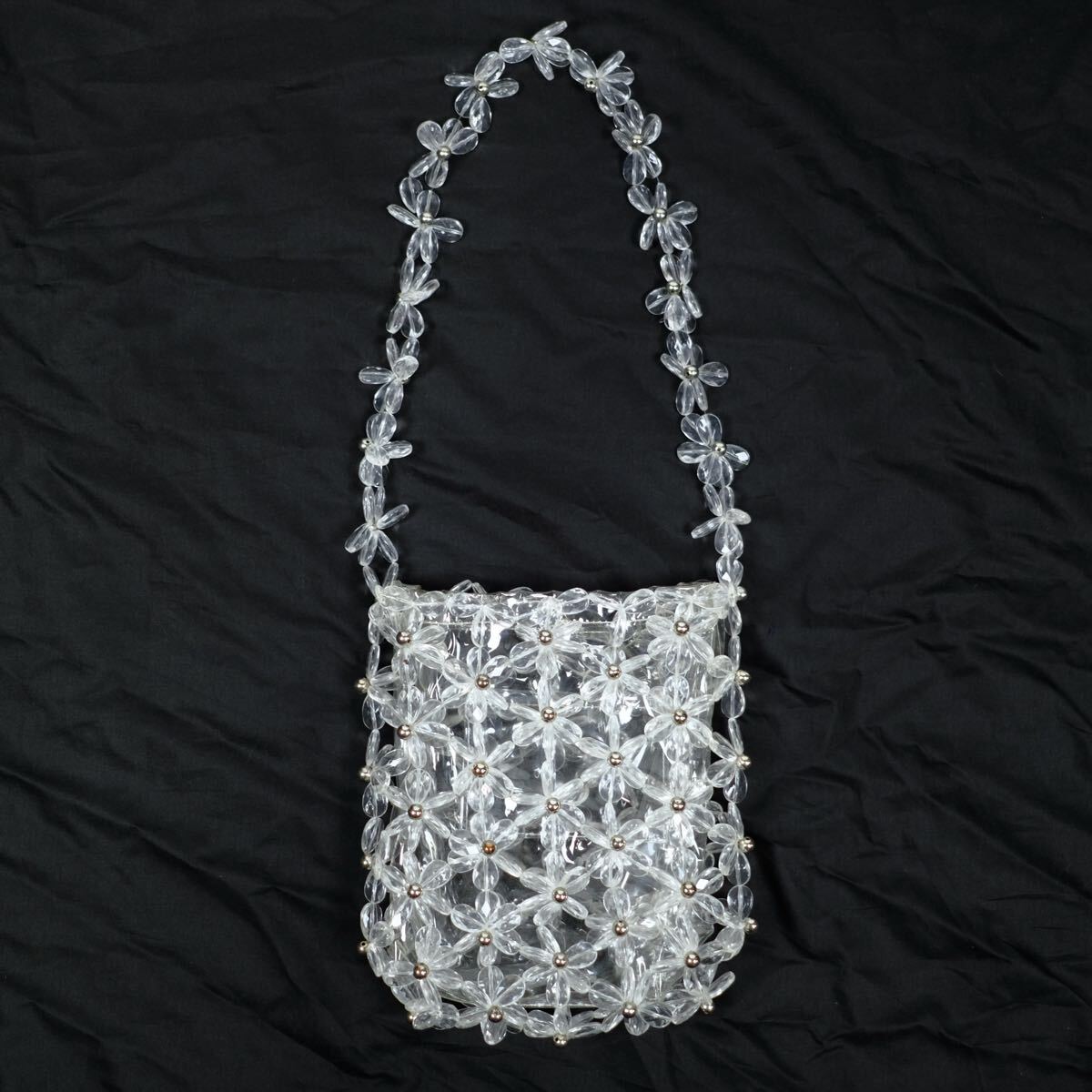 - 1990s ビンテージ 花柄ビーズ ハンドメイドデザイン PVC バッグ ショルダーバッグ ハンドバッグ シルバー系