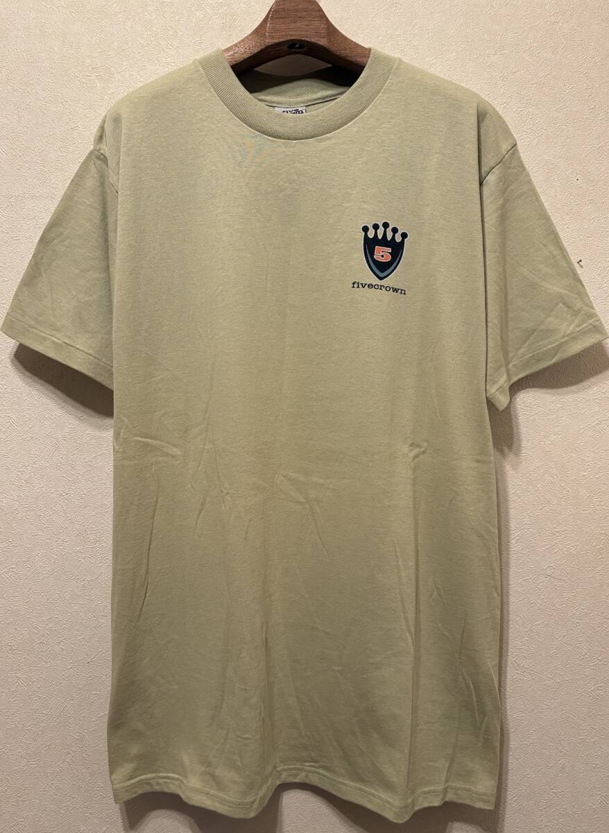 > USA製デッドストック90sオールドfivecrownバックプリントTシャツM~ピスタチオグリーン丸胴コットン袖シングルUS製90年代ビンテージHOT ROD