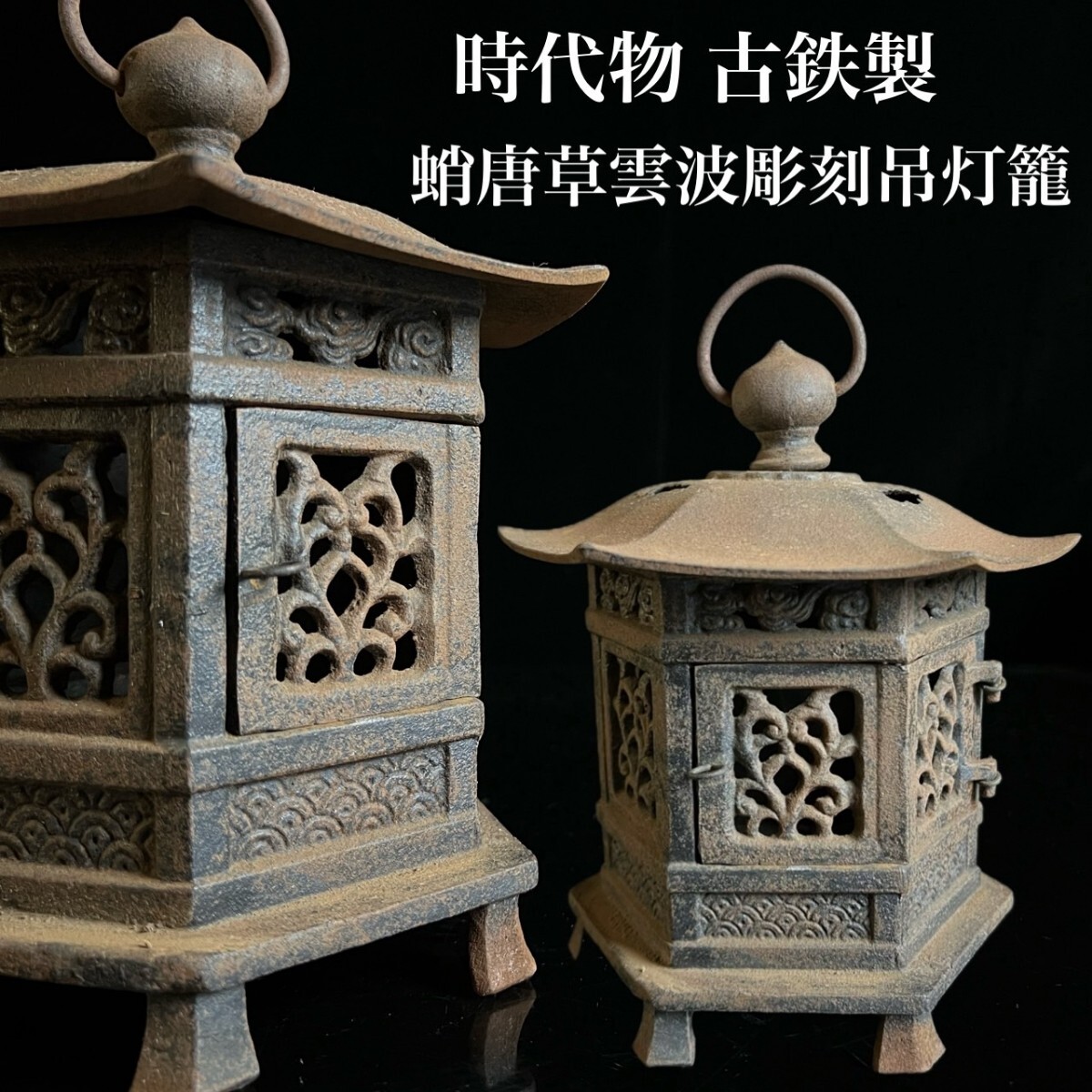 - ◇鸛◇ 時代物 古鉄製 蛸唐草雲波彫刻吊灯籠 20cm 2000g 細密彫刻 小振り 燈籠 灯篭 与次郎 唐物骨董