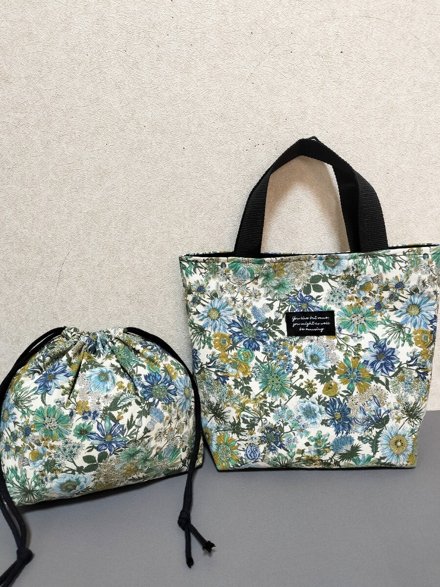 - 2点セットボタニカルフラワー柄トートバッグ、お弁当袋 ランチバッグ 花柄