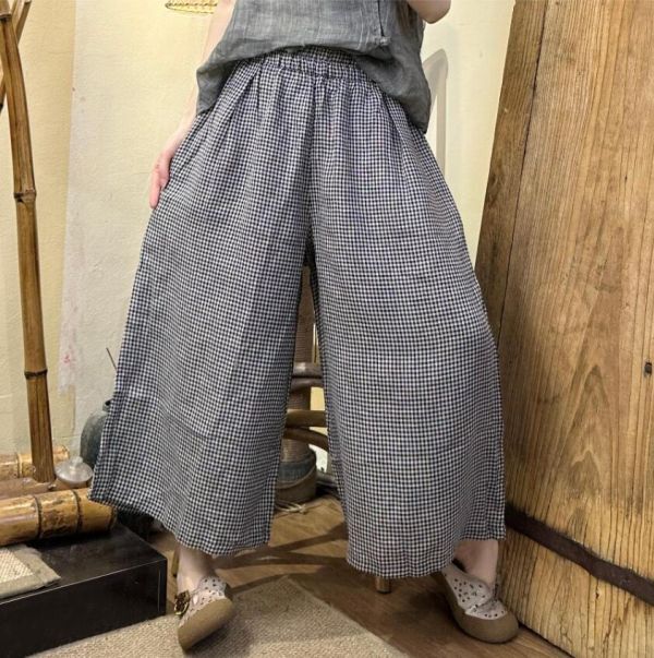 - 新品* ワイドパンツ リネン 麻混 チェック柄 涼しい きれいめ パンツ ボトムス ウエストゴム ポケット付き サルエルパンツ*小