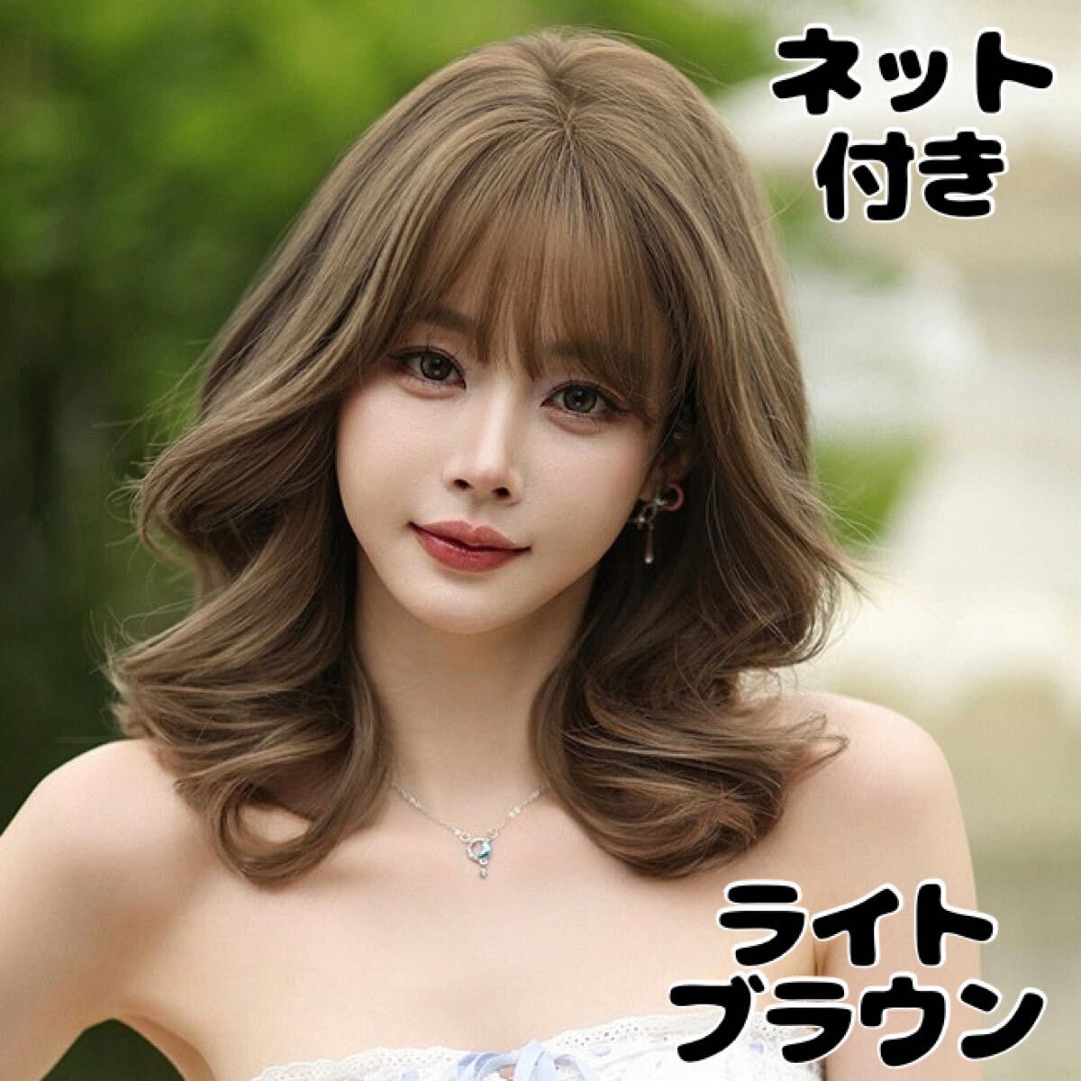 - フルウィッグ セミロング レディース ふんわり巻き髪カール 前髪あり 医療用 ミディアム コスプレ かつら ウェーブ パーマ シースルー