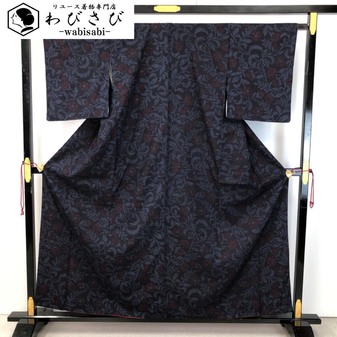 - 本場真綿結城紬 80亀甲 花模様 証紙付 濃紺色 K-5001 着物 きもの kimono 和服 和装 中古 リサイクル着物 【送料無料】