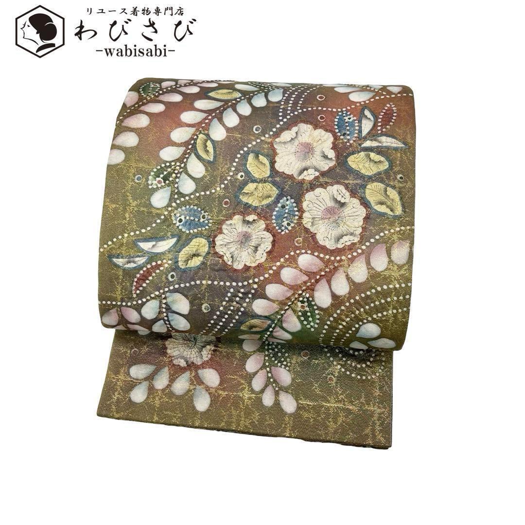 > 袋帯 美しい辻が花模様 金色格子柄 路考茶色 O-3828 着物 きもの kimono 和服 和装 中古 リサイクル着物 【送料無料】