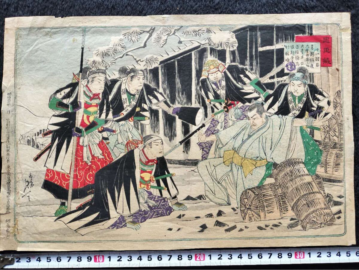 - 明治期/真作 楊斎延一「忠臣藏 十一段目」本物浮世絵木版画 赤穂浪士 武者絵 錦絵 大判 裏打ち
