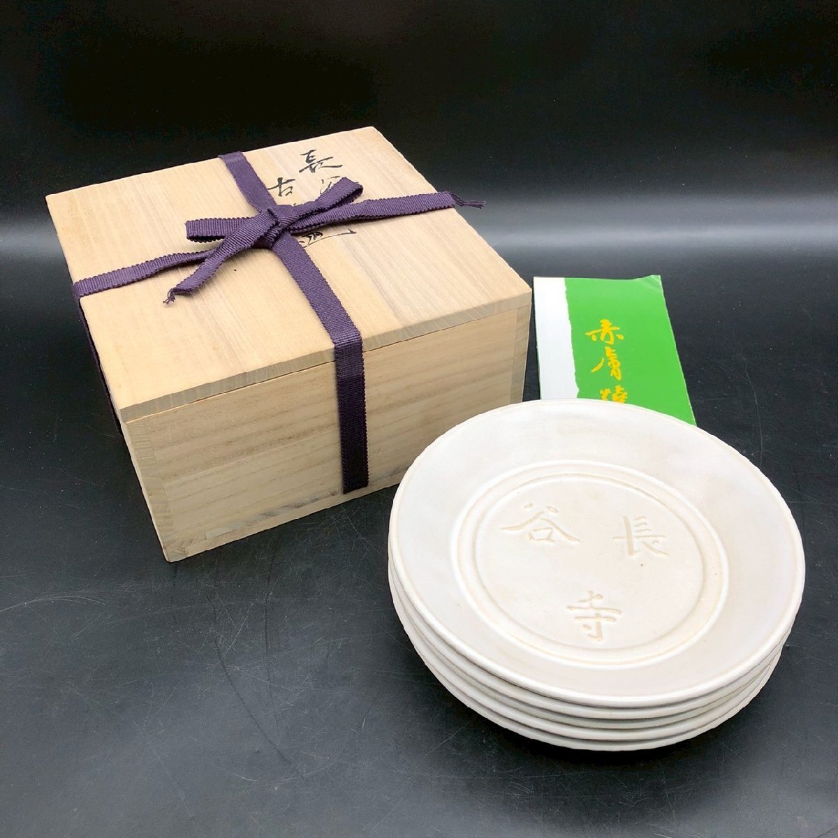 > SW0528-35-3 赤虜焼 長谷寺 皿 陶器 食器 和食器 プレート 刻印 古瓦皿 5客 尾西楽斎 模様皿 小皿 取り皿 白磁 共箱 直径17㎝ 80サイズ