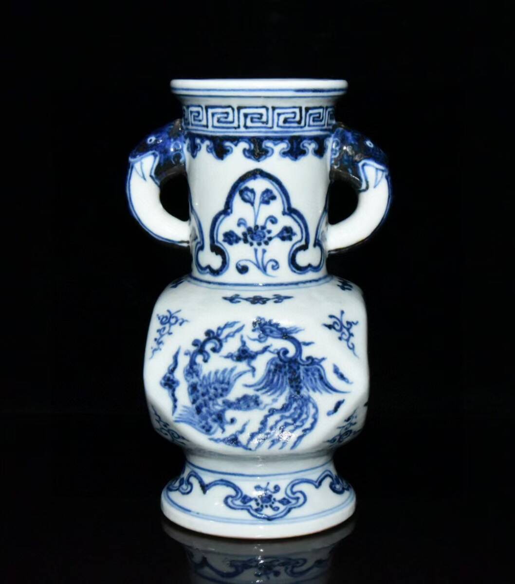 - 【超珍館蔵】明 宣德年製款 古陶瓷品 青花 雙鳳紋 雙耳瓶 陶藝 古賞物 古董品 古美術品 時代物 旧家蔵出 稀少珍蔵品