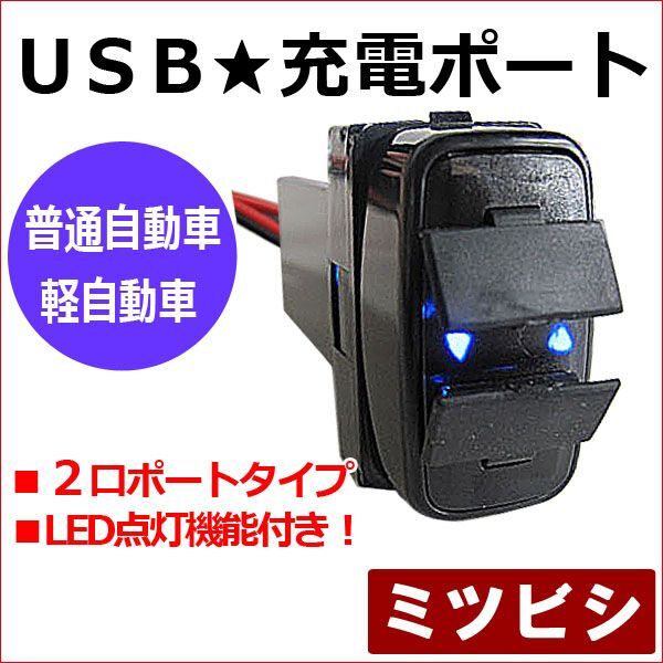 > 【互換品】(車載用) USB充電ポート増設キット/ USB2ポート / ミツビシ車用 / 37x22mm / LED色:ブルー