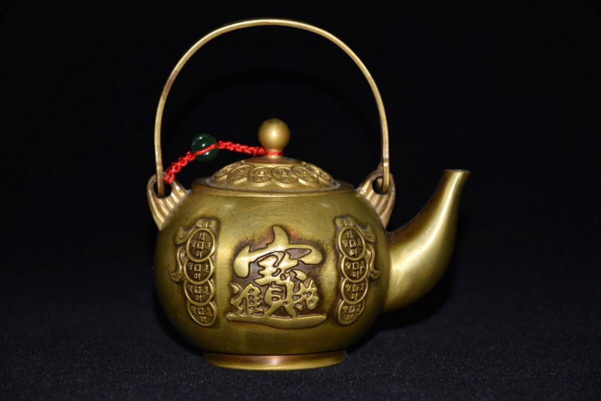 - 蔵友旧蔵出 銅製 金鍍 招財進寶紋 提梁酒壺 希少珍品 貴重品 置物 古賞物 中国古玩 中国古美術品
