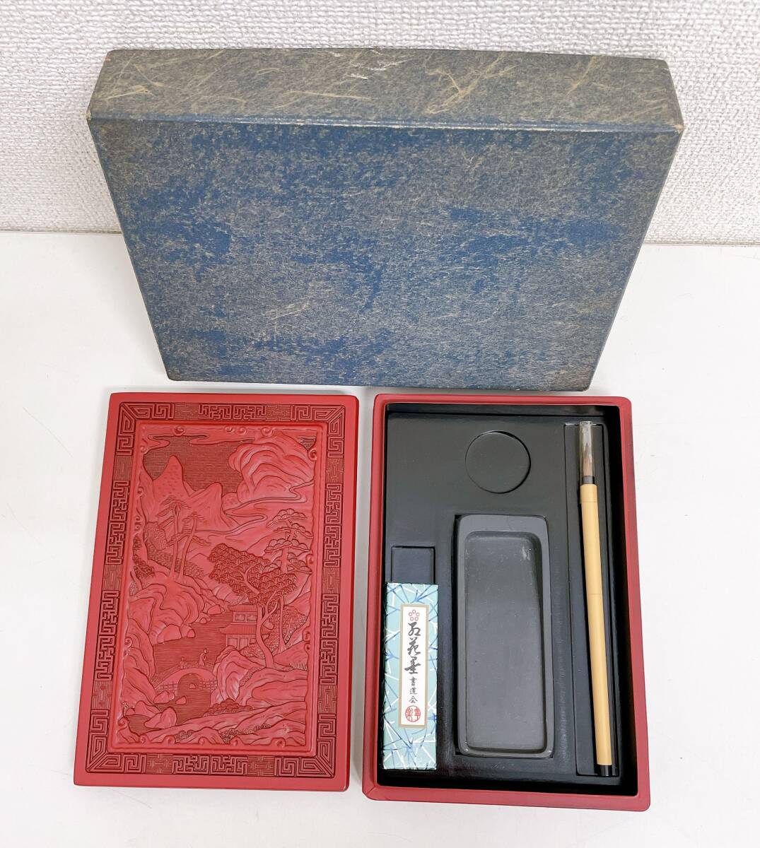 - 【堆朱楼閣山水図 書道具セット 硯箱】文箱/道具箱/保管箱/昭和レトロ/筆/墨/現状品/A76-450