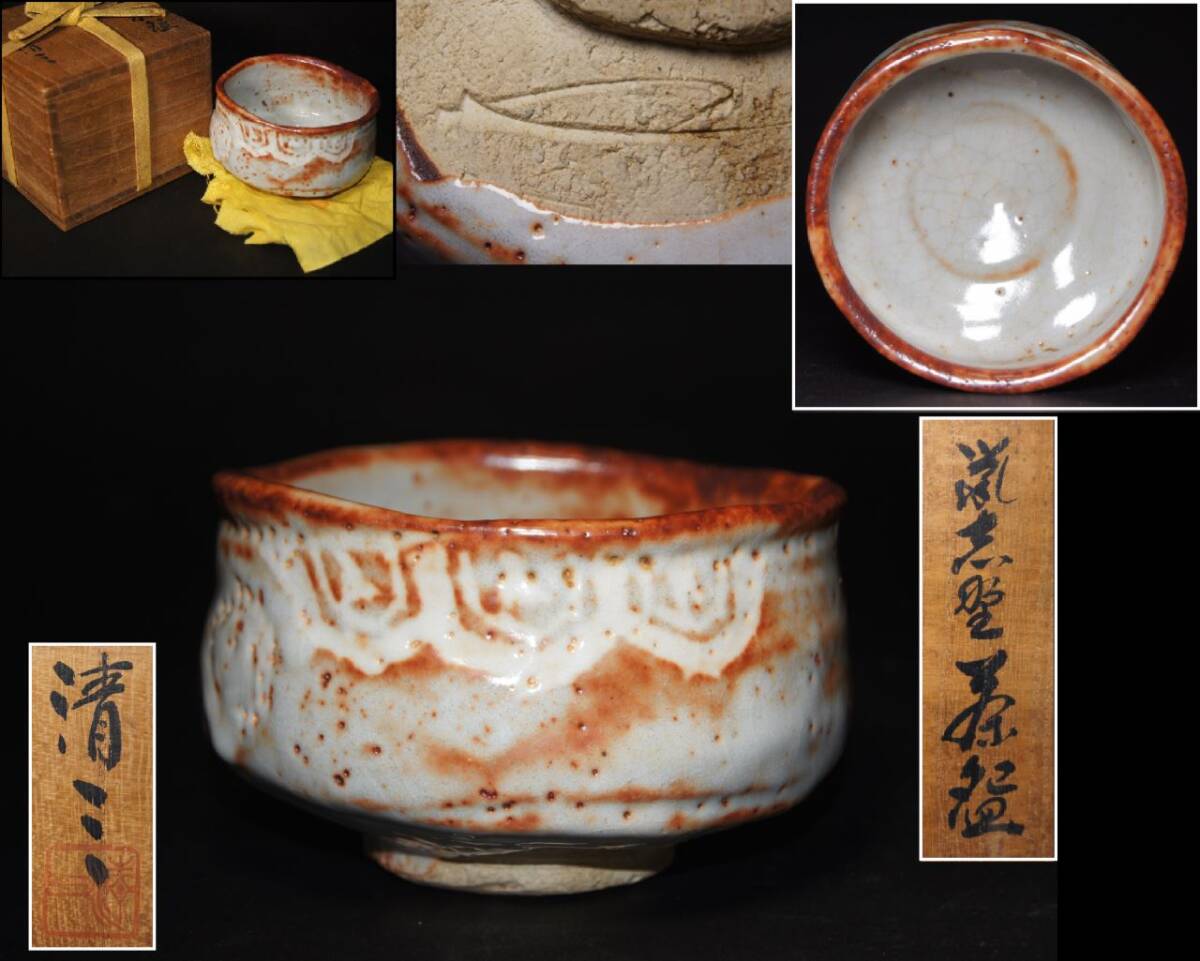 > 真贋保証■加藤清三(景清)作■ 鼡志野茶碗 共箱・共布 鼠志野 茶道具 美濃陶祖十三代 茶器 抹茶碗 抹茶茶碗 茶会