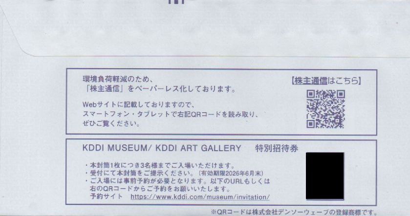 > KDDI 株主優待券 KDDI MUSEUM/KDDI ART GALLERY 特別招待券 1枚 3名まで 有効期限:2026年6月30日 普通郵便・ミニレター対応可