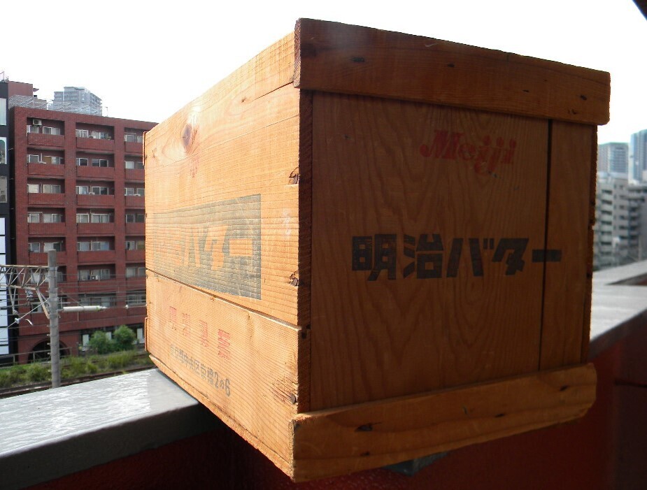- 明治製菓 バター 木箱 Vintage 中央区 京橋 46.5㎝×28㎝×30㎝ カートン 道具箱 レストア 収納 ガレージインテリア 工具 アトリエ 旧車