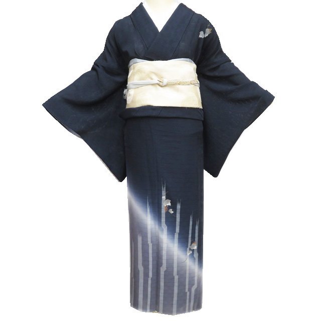 - 夏物 夏着物 付下げ 付け下げ 訪問着 着物 中古 正絹 蔦の図 濃紺色 多色 身丈166cm 裄68.5cm L トール きもの北條 A1226-12