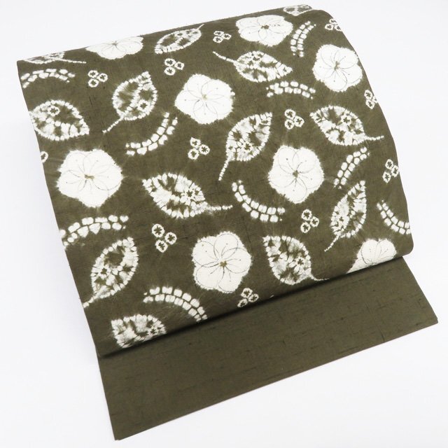 - 特選 開き名古屋帯 なごや帯 中古 リサイクル 正絹 カジュアル 仕立て上がり 紬地 絞り染め 花模様 辻が花 海松色 きもの北條 A1228-12