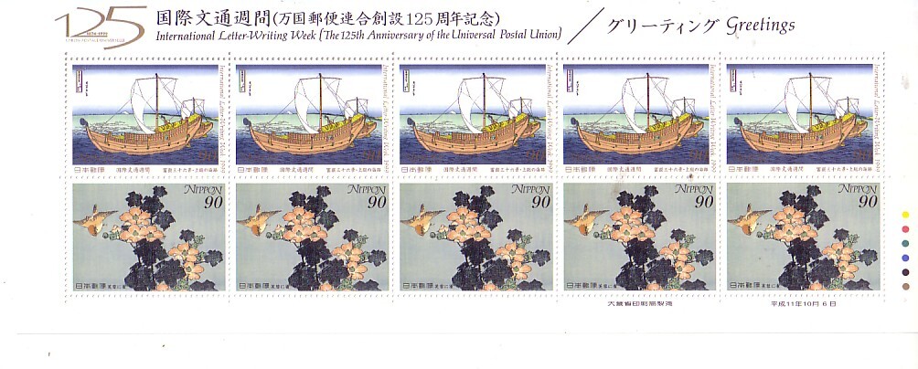 - 「国際文通週間1999 富嶽三十六景・上総の海路/芙蓉に雀」の記念切手です