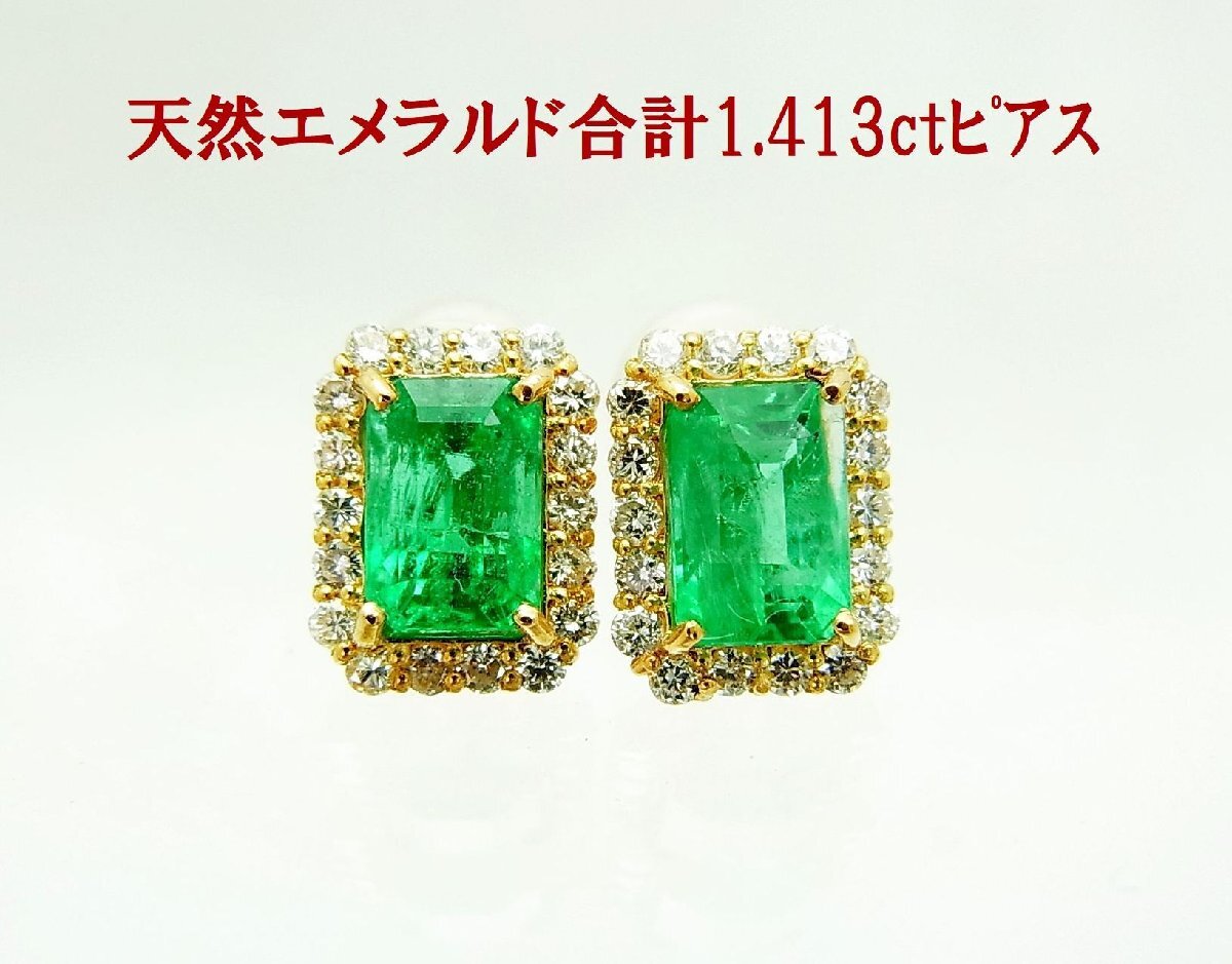 > 上質天然エメラルド0.720ct 0.693ct 計1.413ct 天然ダイヤ取巻 18金枠ピアス 卸価格 商品動画あり 送料込み