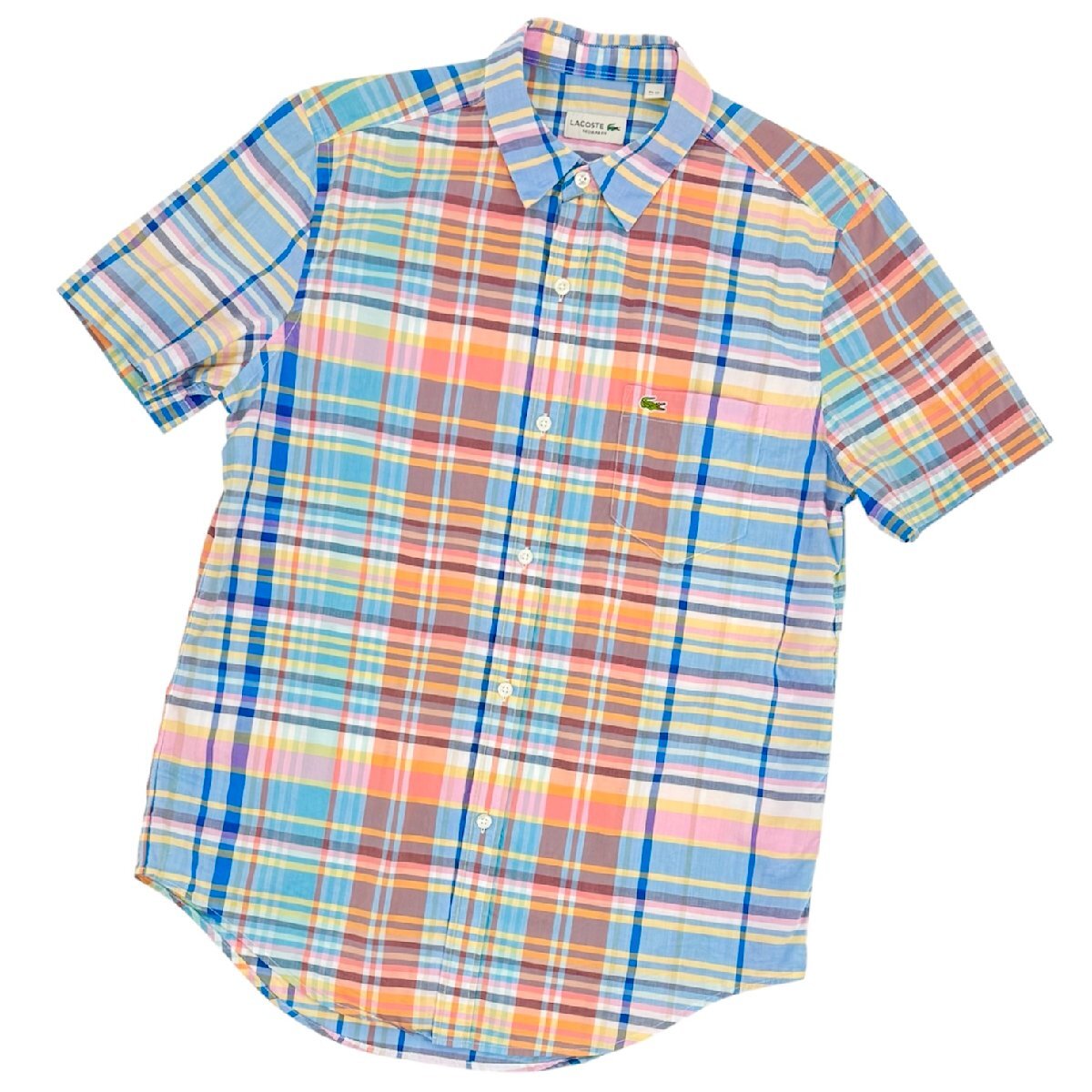 - LACOSTE ラコステ マドラス チェック柄 コットン ポプリン 半袖 レギュラーカラー シャツ CH6368 メンズ FR40 M~L相当 水色 定価¥15,400-