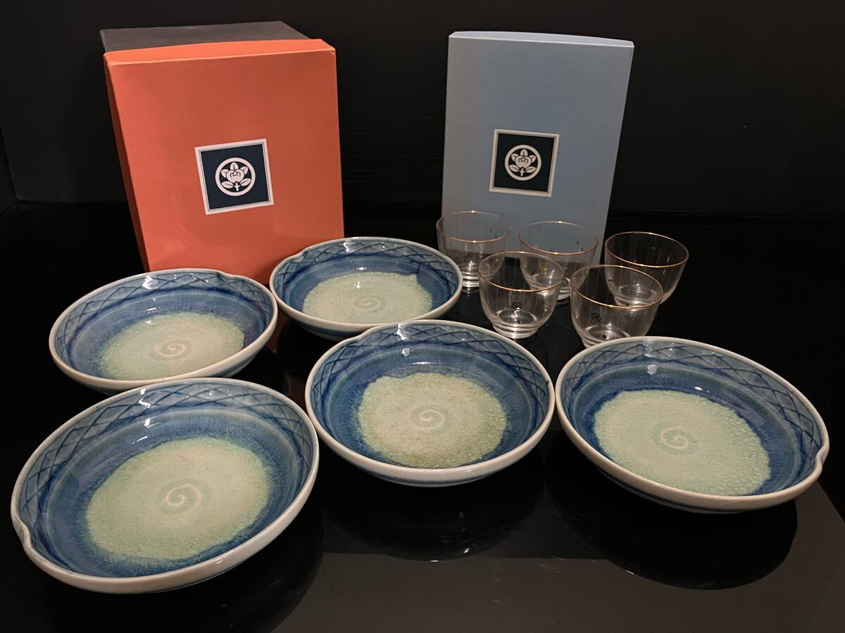 - D(0709k3) たち吉 橘吉 まとめ売り 5客セット 藍ぞめ 中鉢 水明 冷茶碗 グラス ガラス 陶器 茶器 和食器