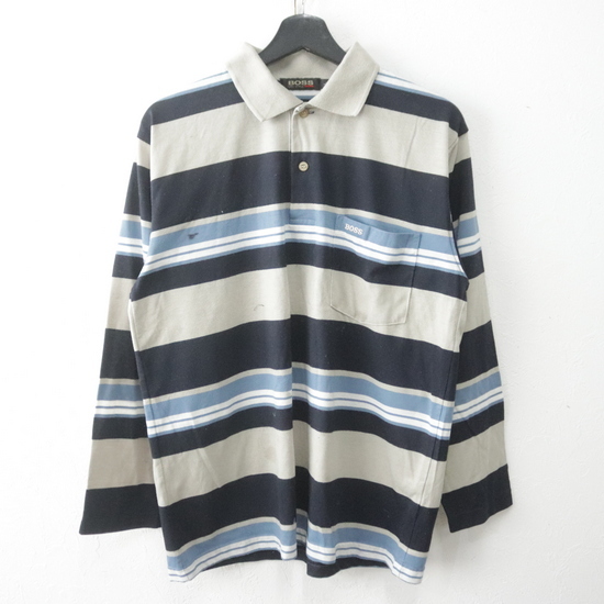 > M686 2000年代製 BOSS 半袖ポロシャツ■00s 表記Lサイズ ボーダー ベージュ ネイビー 古着 アメカジ ストリート 90s 80s 70s 60s 激安 紺