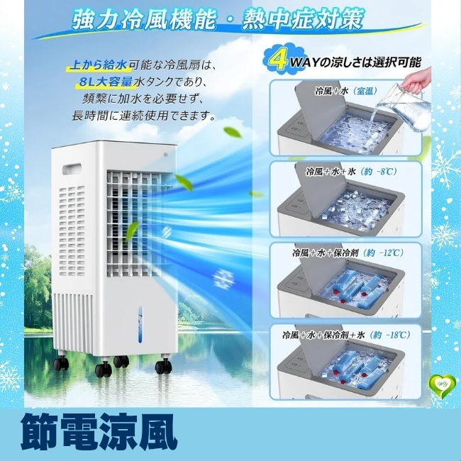 - 【節電涼風】冷風機 3方向吸気 冷風モード 保冷パック付 8L大容量 人気 おすすめ