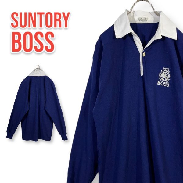 > 【美品】貴重レア 非売品 SUNTORY COFFEE BOSS サントリーボス ラグビー 長袖 ラガーシャツ ジャージ フリー ネイビー 紺色 ノベルティー