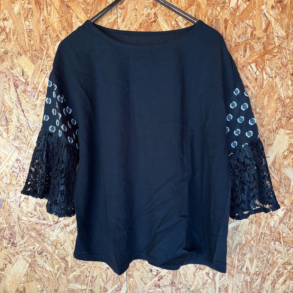 - 美品 GALLARDA GALANTE カットソー お洒落 七分袖カットソー ブラック 袖フリル 生地切替 レディース トップス 4707