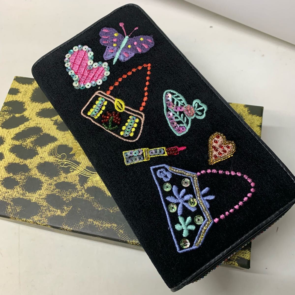 - 【未使用に近い】シンクビー コスメ柄 長財布 ブラックポンド ラウンド財布 Think Bee! Just Heart ラウンドファスナー