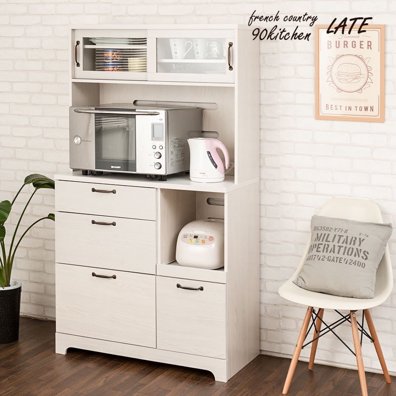- 家電収納 キッチンボード 幅90cm 高さ160 ホワイト木目色 カップボード 食器棚 レンジ台 レンジボード 引き出し 収納家具 引き戸 引戸