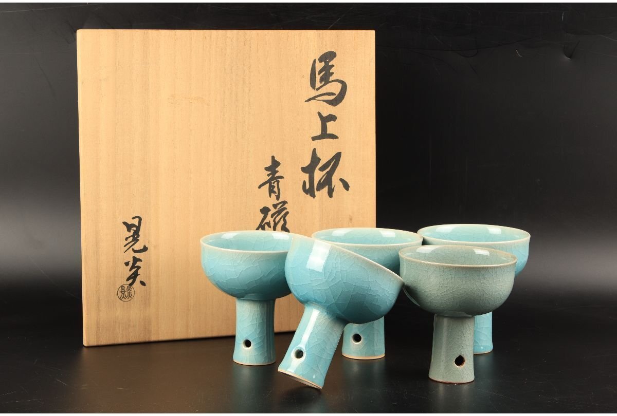 - [ギャラ藤]晃炎/青磁馬上杯5客/共箱/G-1884 (検索)骨董/湯呑/茶器/茶碗/酒器/酒盃/酒杯/猪口/馬上杯