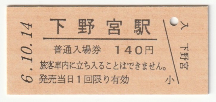 - 平成6年10月14日 水郡線 下野宮駅 140円硬券普通入場券(日付印刷)