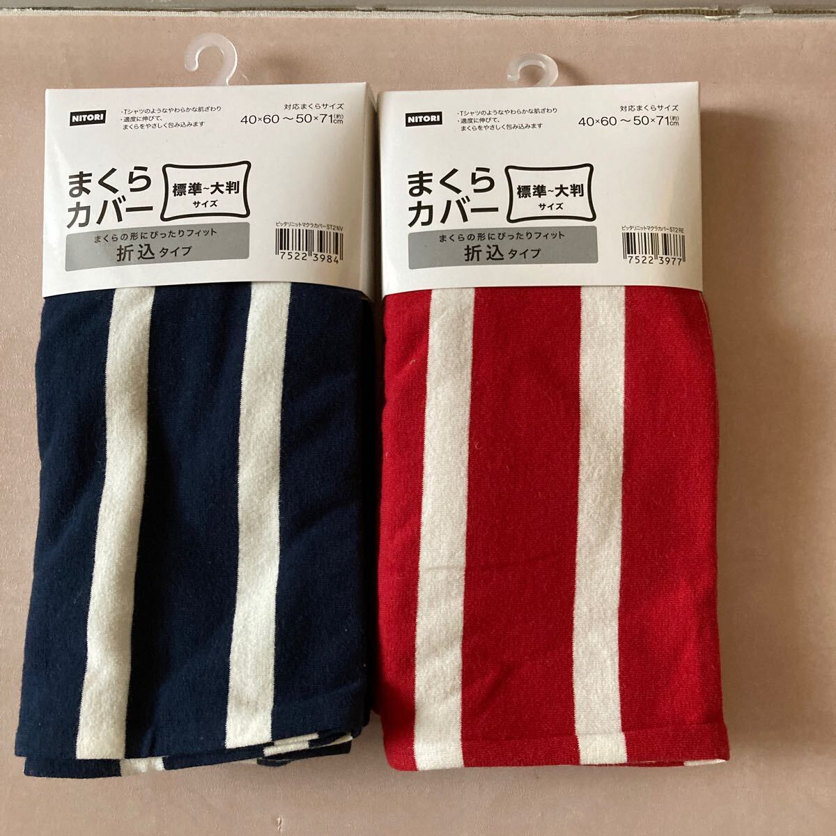 > n 5683 未使用 ニトリ枕カバー 標準〜大判サイズ 折り込みタイプ 40×60〜50×71㎝ 赤色ストライプ 紺色ストライプ 2枚セット