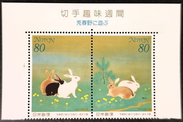 > [25071704]【切手趣味週間・1999年】2種連刷 タイトル付 堂本印象画「兎春野に遊ぶ」80円×2 美品