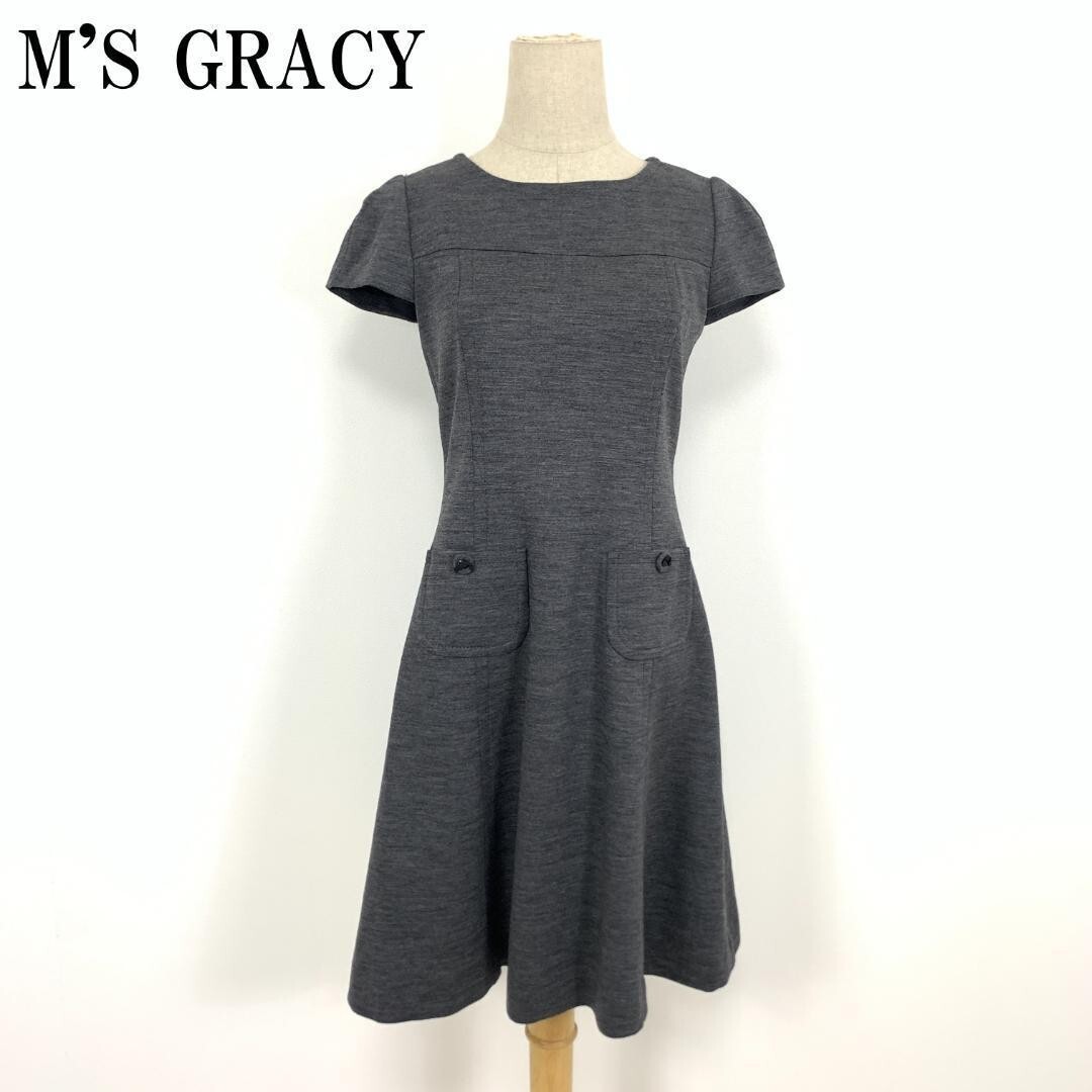 > LA6930 エムズグレイシー ウール 半袖フレアワンピース M'S GRACY カジュアル フロントポケット 切替デザイングレー 36