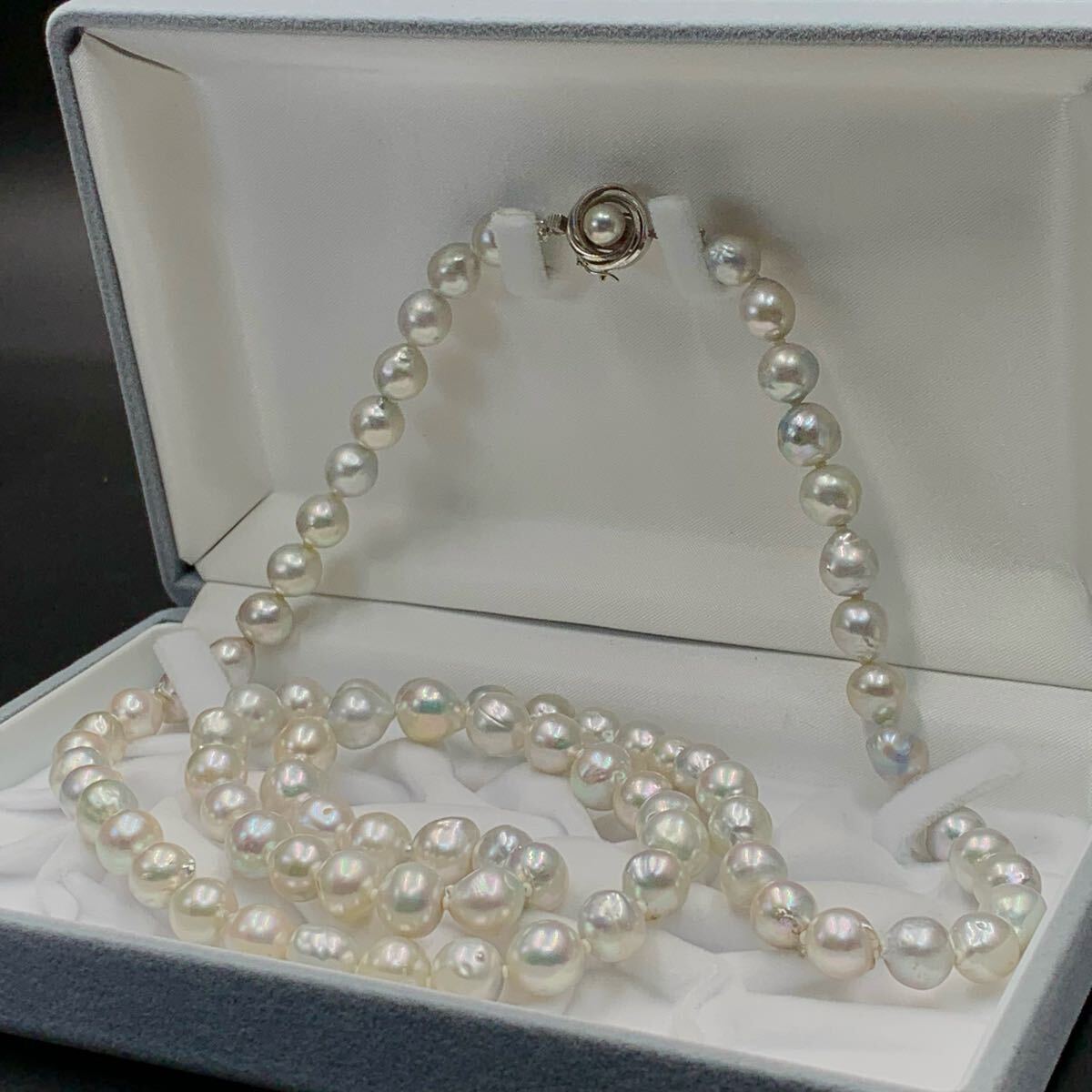 - K14WG アコヤ あこや ブルー グレー パール ロング ネックレス 本真珠 照り抜群 約8.5mm-10mm 約85cm 約94.5g 14金 ホワイトゴールド