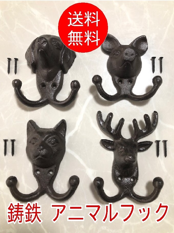 - 【鋳鉄】4種セット アニマルフック 小犬 小豚 小猫 小鹿 動物 壁掛け アンティーク 収納フック 園芸 道具整理