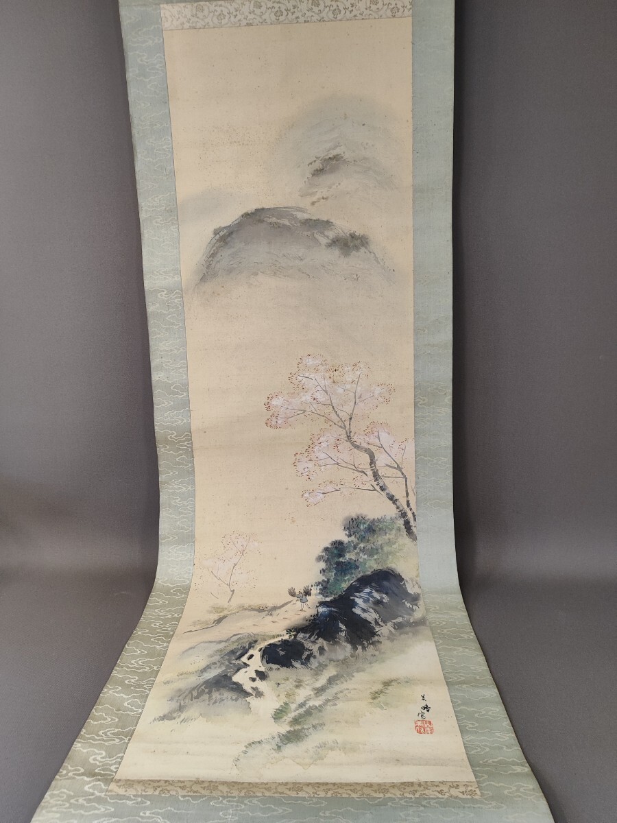- k46 山水図 【美峰】作 掛軸 古美術 骨董品 時代物 日本画 絹本 肉筆 アンティーク 模写