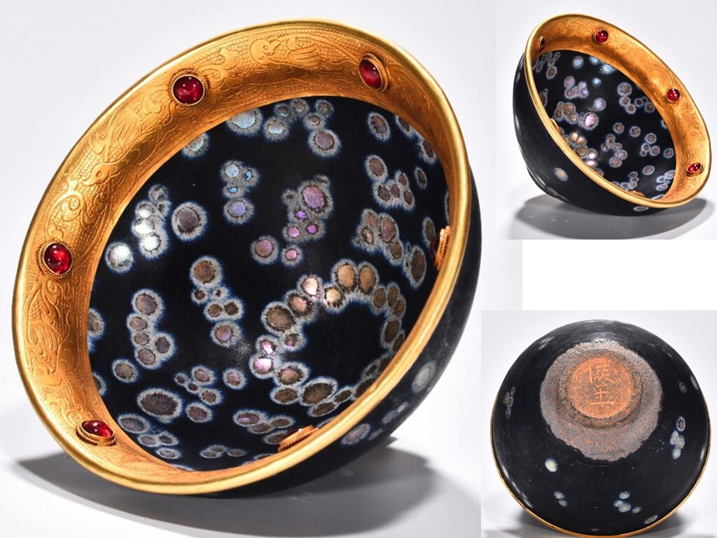 - ■TB416■宋時代 建窯 夜光盞 天目盞5 流金嵌寶石 候王款 時代物 古玩 唐物 古陶磁器■
