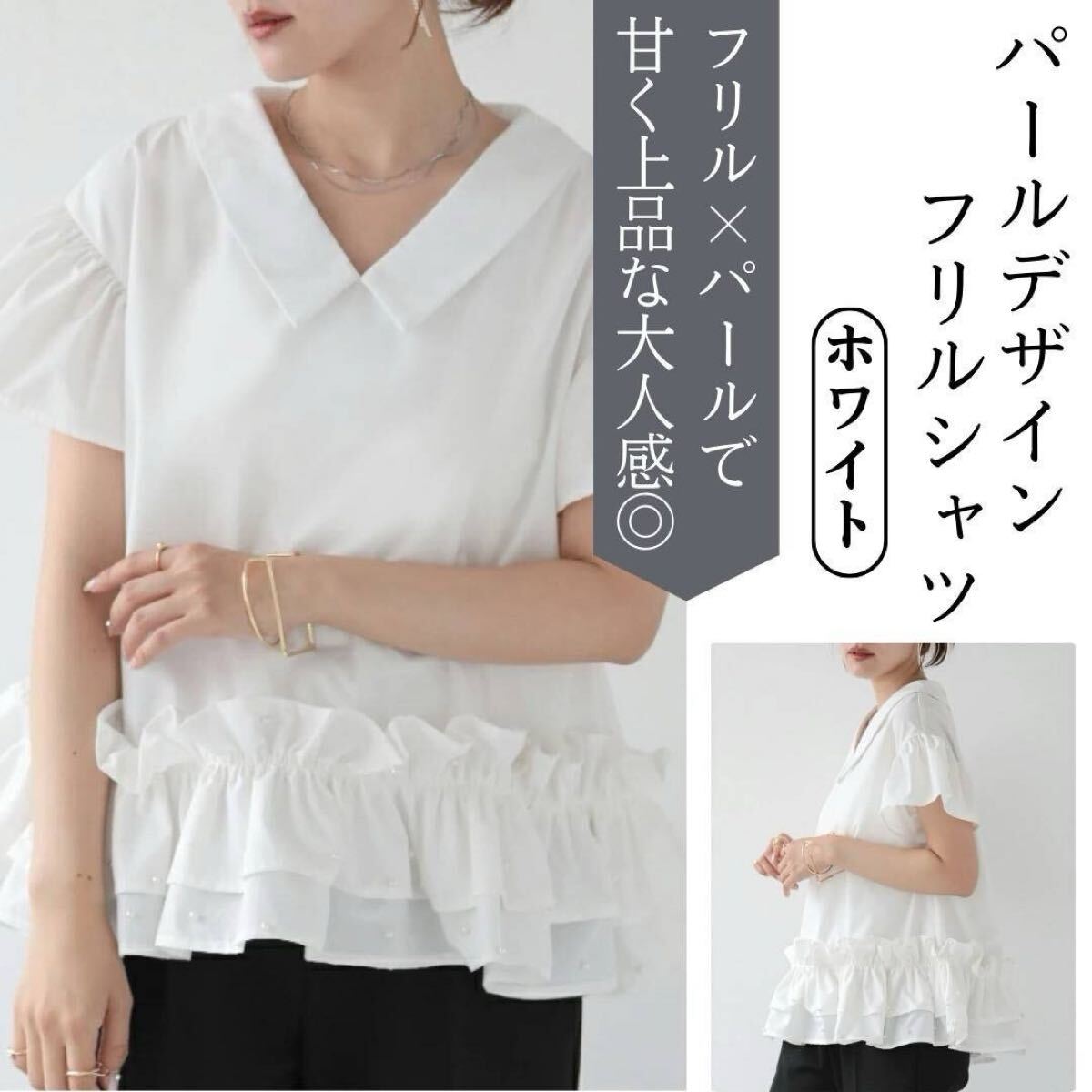 - 新品!パール フリル シャツ ホワイト 半袖 襟付き 上品 大人感 パフスリーブ