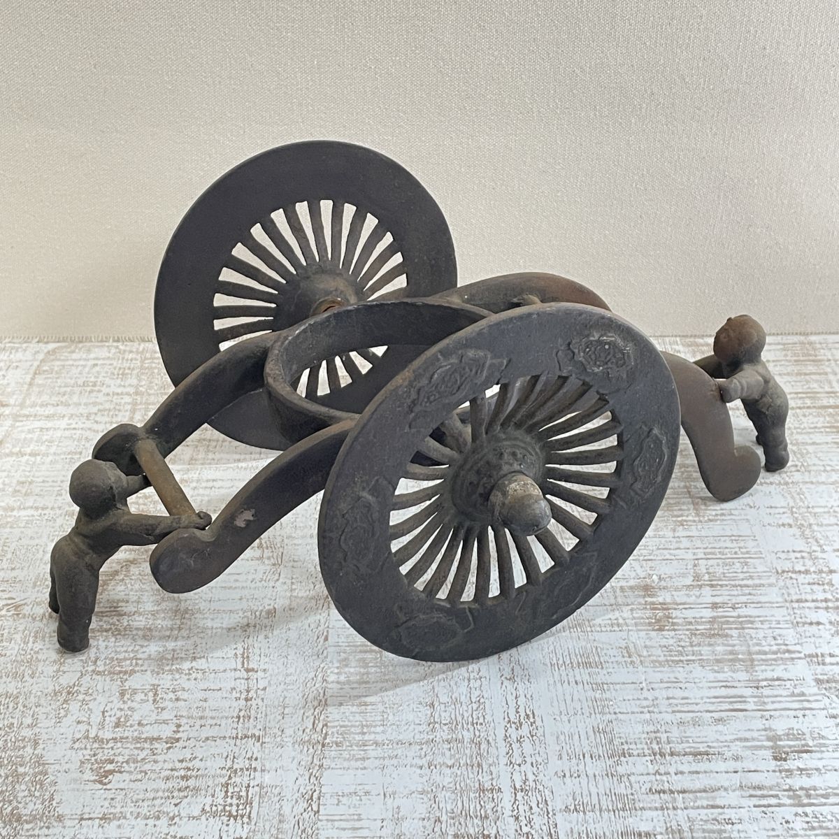 > CG22【骨董品】唐子が可愛らしい 金属製 御所車型 薄端 / 時代物 金属工芸 骨董 鉄製 三足 古銅 古玩 中国美術
