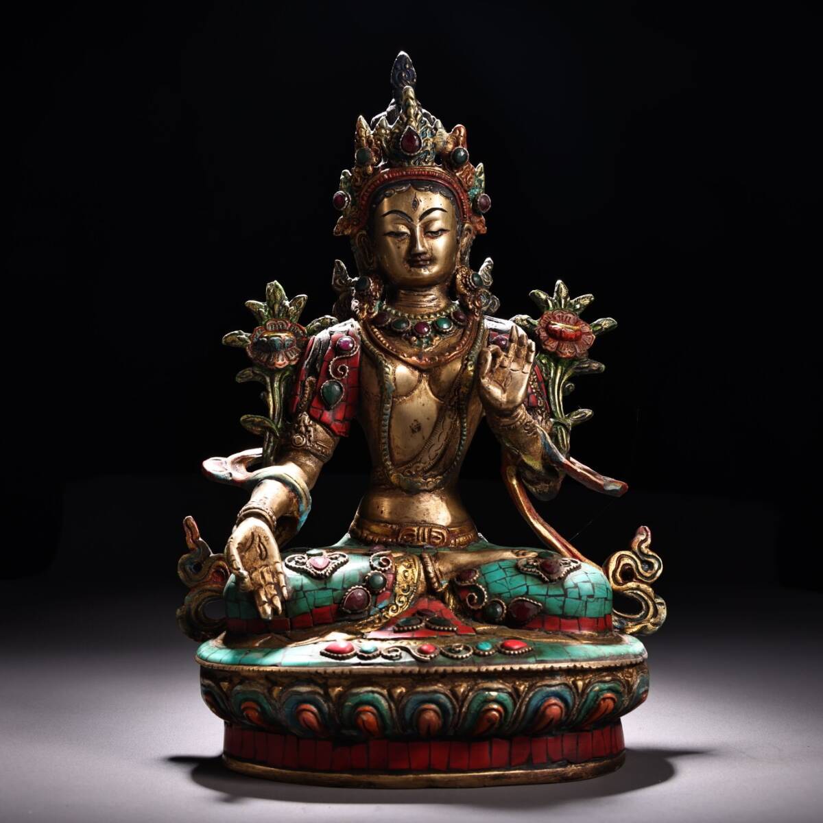 - 『館蔵珍品 銅製 寶石嵌 描金 彩繪 白度母像 仏像 宗教 仏教古美術 供養品』稀少珍蔵品 古賞物 貴重物品 収蔵品 中国古美術 時代物 古董品